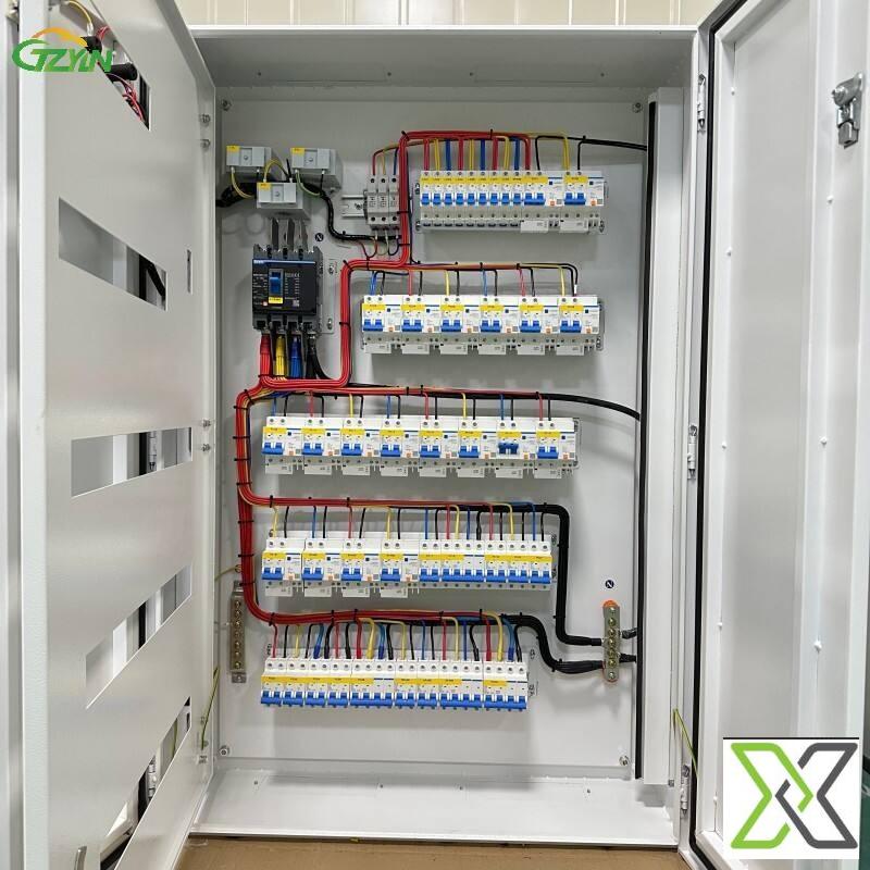 The unit incorporates circuit breakers and protection devices designed to support circuit switching and protection against overload and short-circuit conditions. The internal configuration includes organized busbar arrangements and modular installation to facilitate circuit management and maintenance.