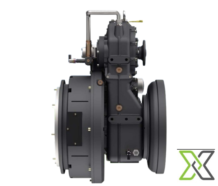 The PHT900 is a parallel hybrid transmission designed for larger vessels to integrate diesel and electric propulsion. The unit features integrated Power Take-Off (PTO) and Power Take-In (PTI) capabilities with a built-in ratio. It utilizes an electromagnetic clutch compatible with DC 24V or 110V systems. The driveline configuration supports parallel operation for redundancy.
